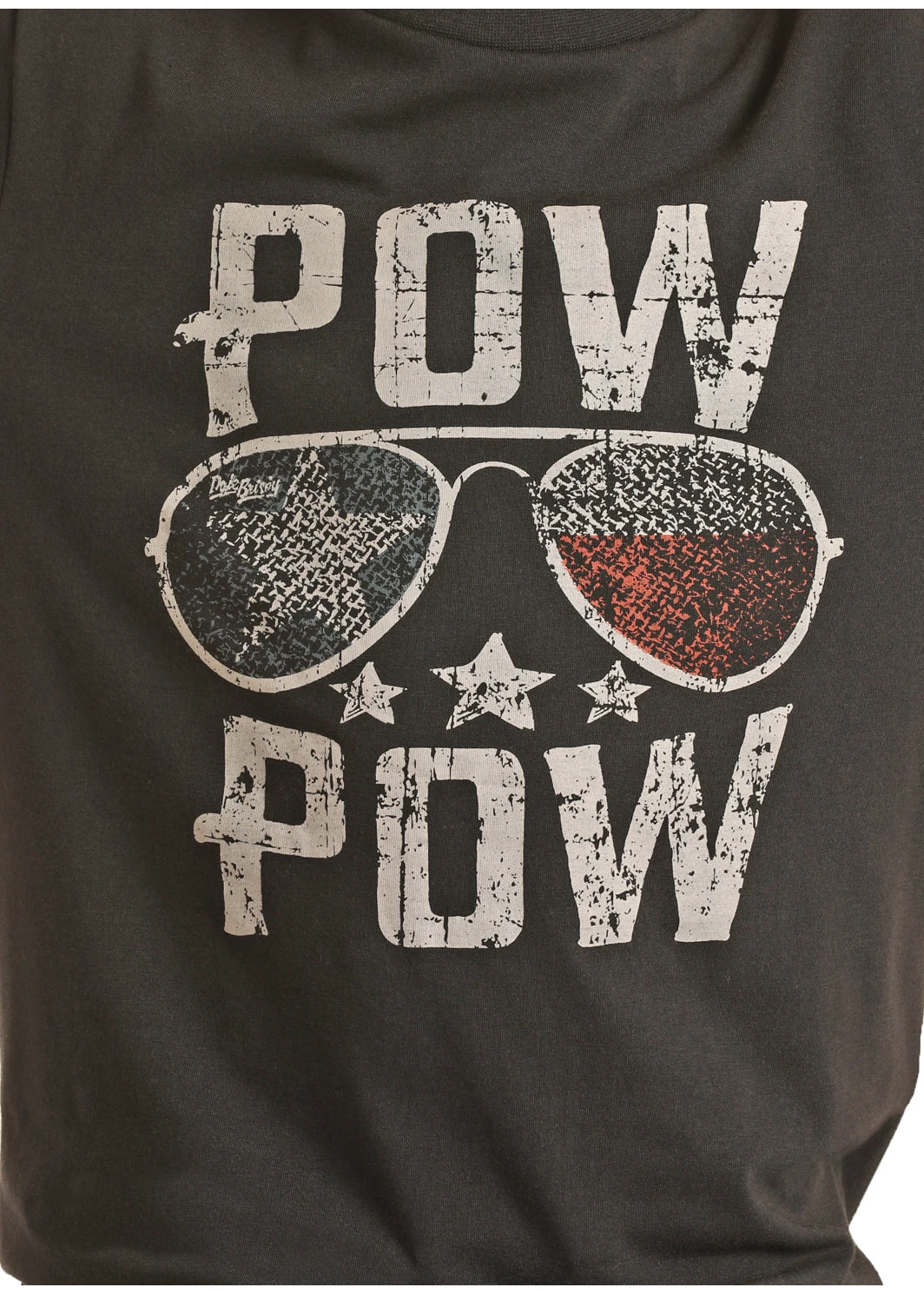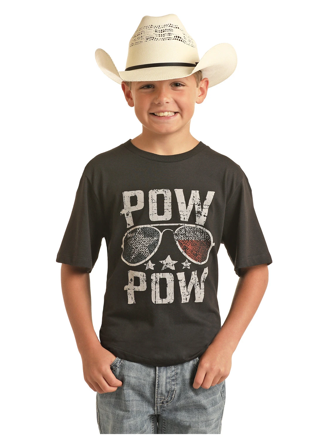 Boys black tee with P.O.W. motif by Dale Brisby. American Flag inside glasses. Patriotism at it’s best when we start to teach them young!Â