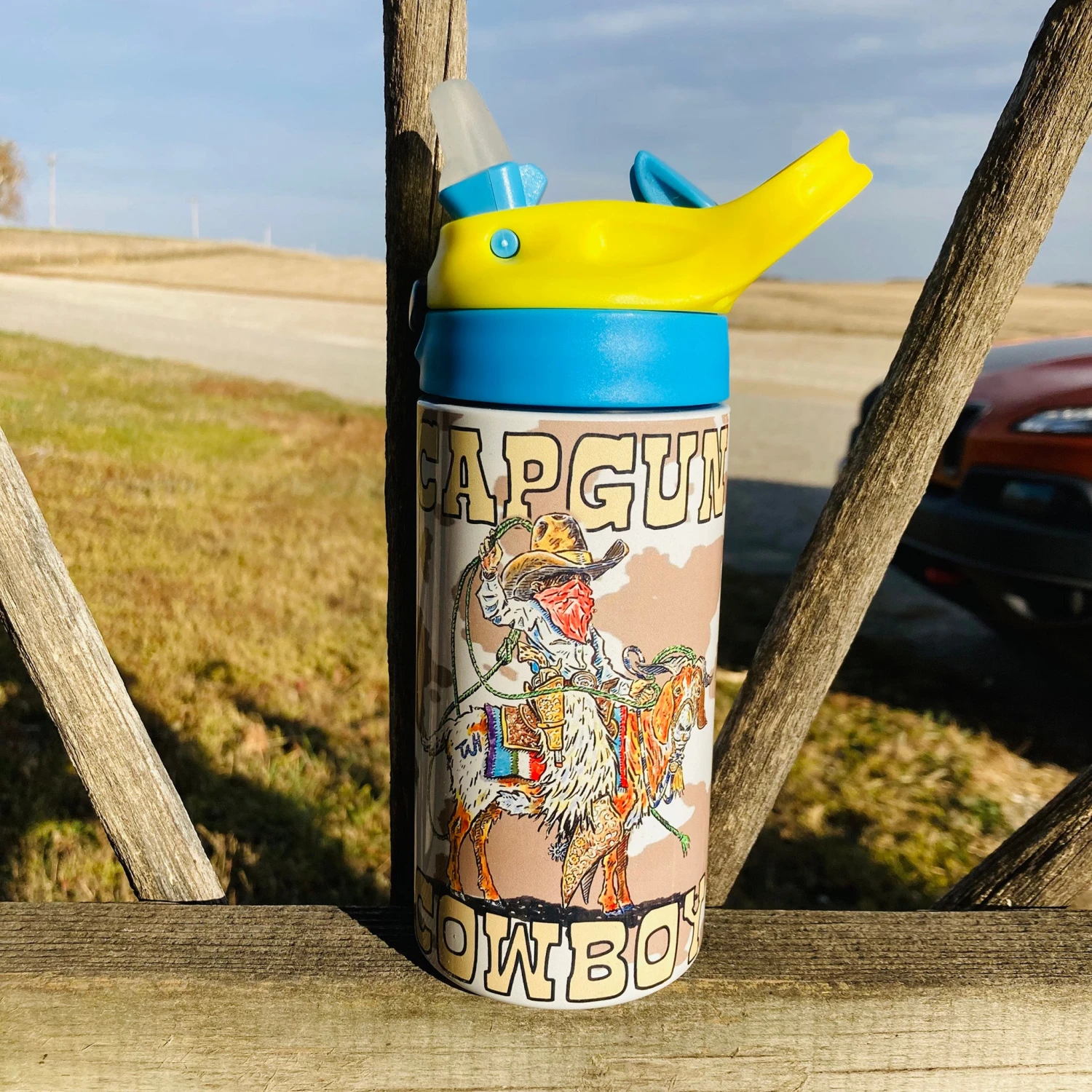 Your wildest little cowpoke will love this new “cap gun cowboy” tumbler! These kid tumblers have the pop top lids with straw, which makes drinking easy and the snap close spout to prevent exposure of unwanted items. They are spill proof, easy to clean, and keep your kiddos drink cold throughout the day.
