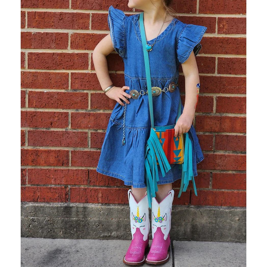 This cute denim dress is a Western Edge favorite. Dress this little dress up with all the extras or leave it as is either way it will be your little cowgirls favorite dress to wear.Â