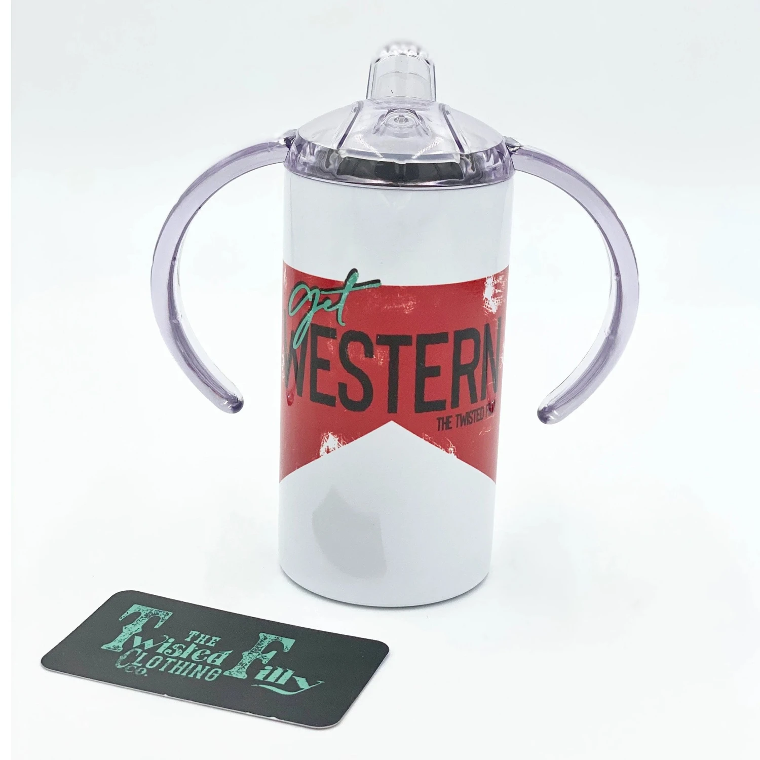 Every little cowboy/cowgirl needs this “Get Western” sippy cup! It holds 12 oz, is insulated and leak proof. It is made of metal, durable, and has handles for easy gripping.Â