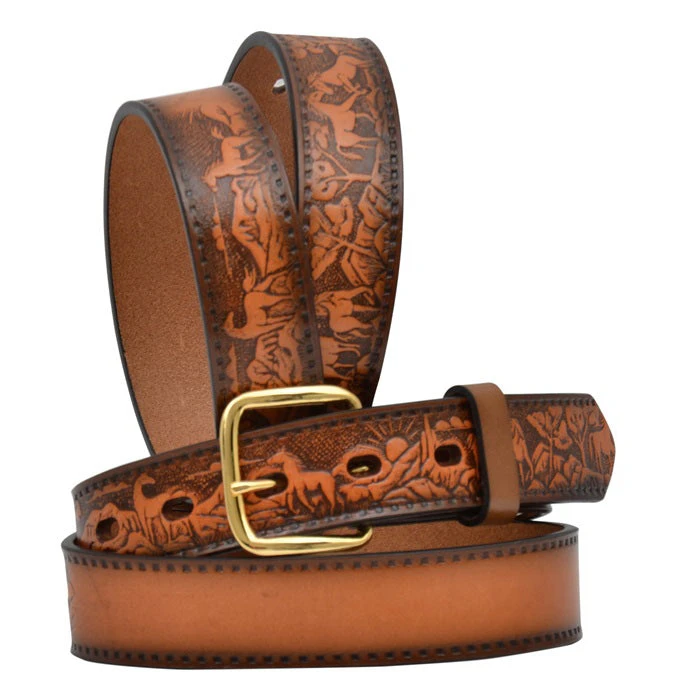 This kid’s belt from 3D Belt Company features a engraved horses throughout the belt. The middle of the belt has a blank leather spot, perfect for engraving names into.Β
