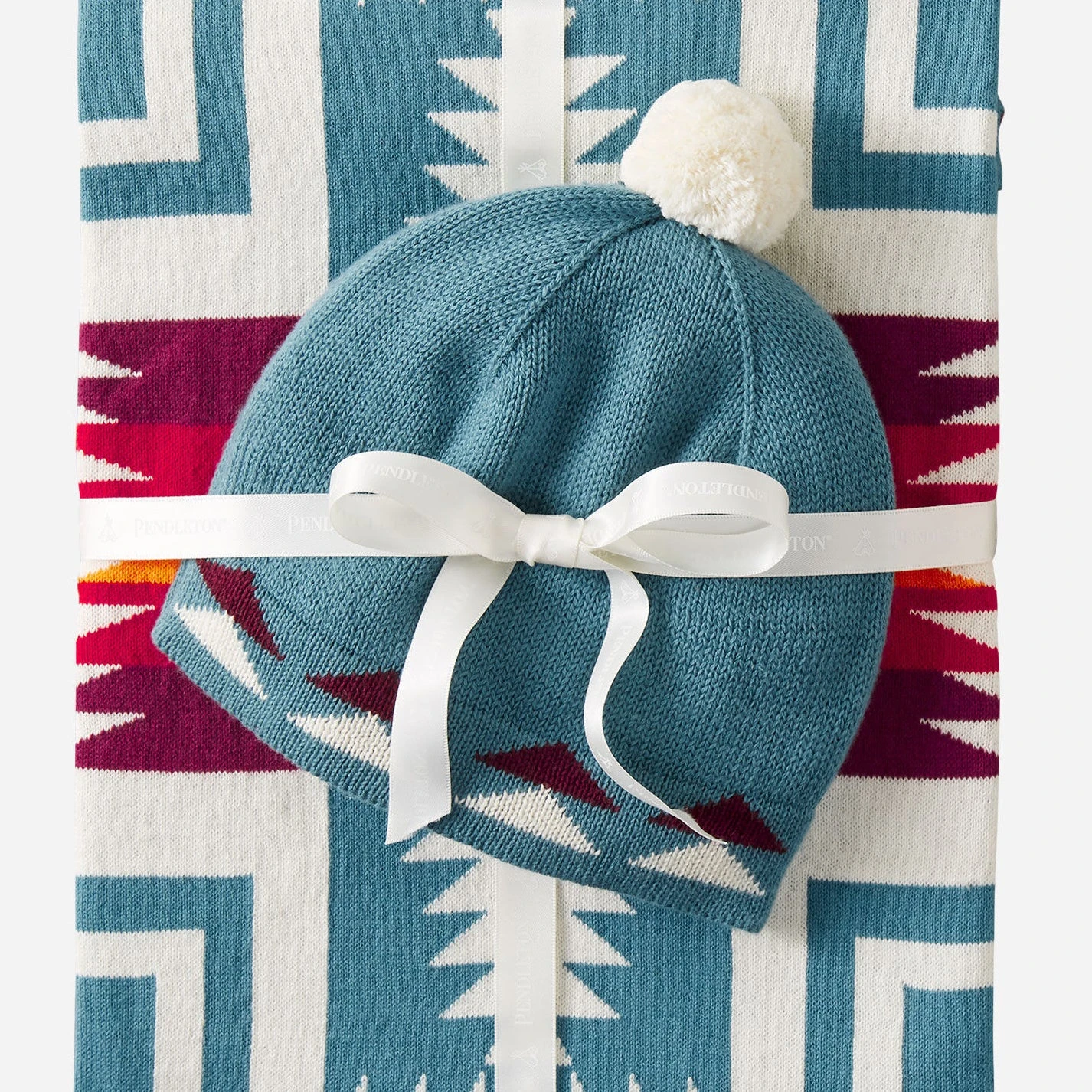 Cuddle with your new little one with this soft, machine washable, cotton knit western blue patterned blanket. The blanket comes with a matching beanie to keep your little one’s head warm.