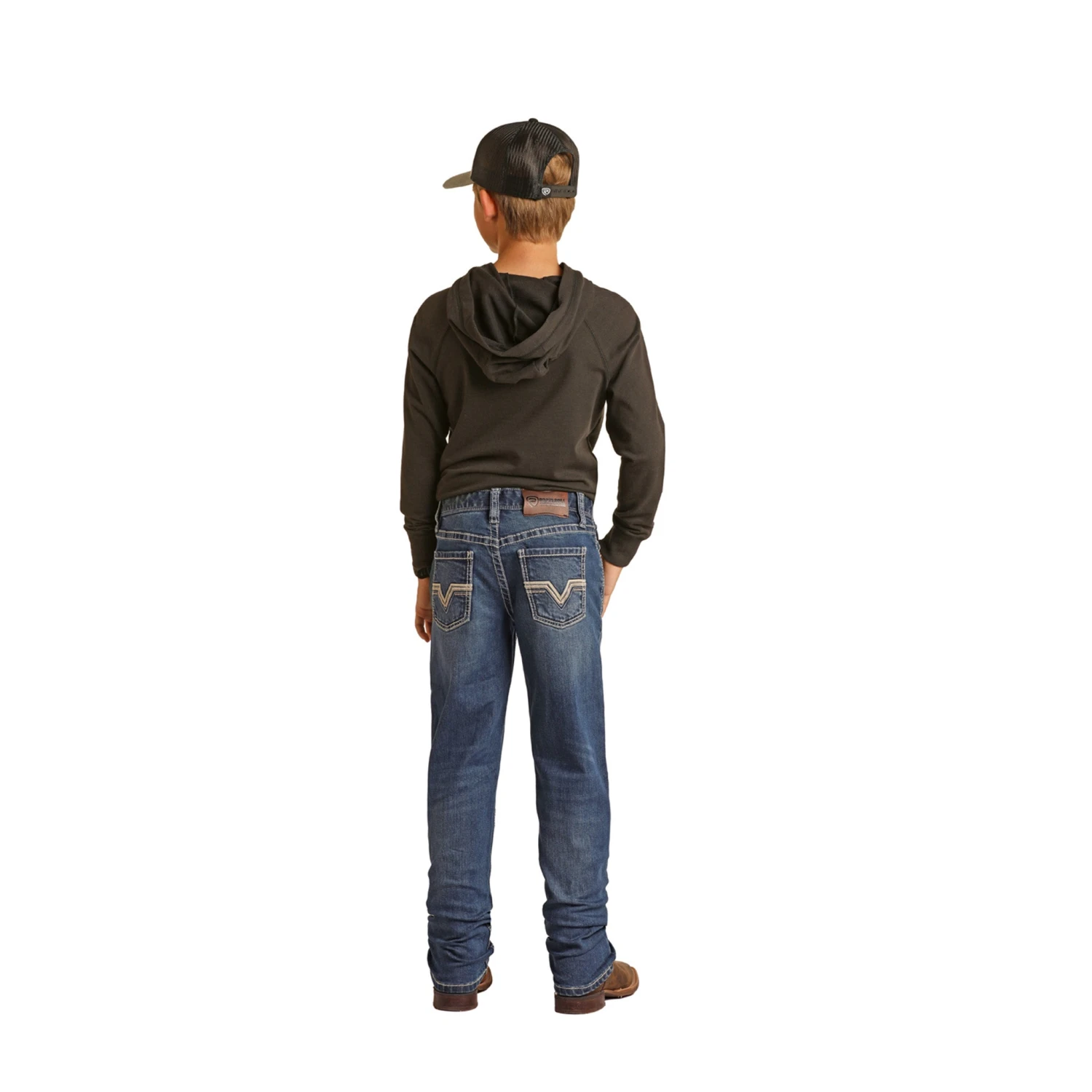 Boy’s reflex stretch straight leg jean (stacks over boots) in a dark vintage wash, perfect for anything your little cowboy has going on for the day.